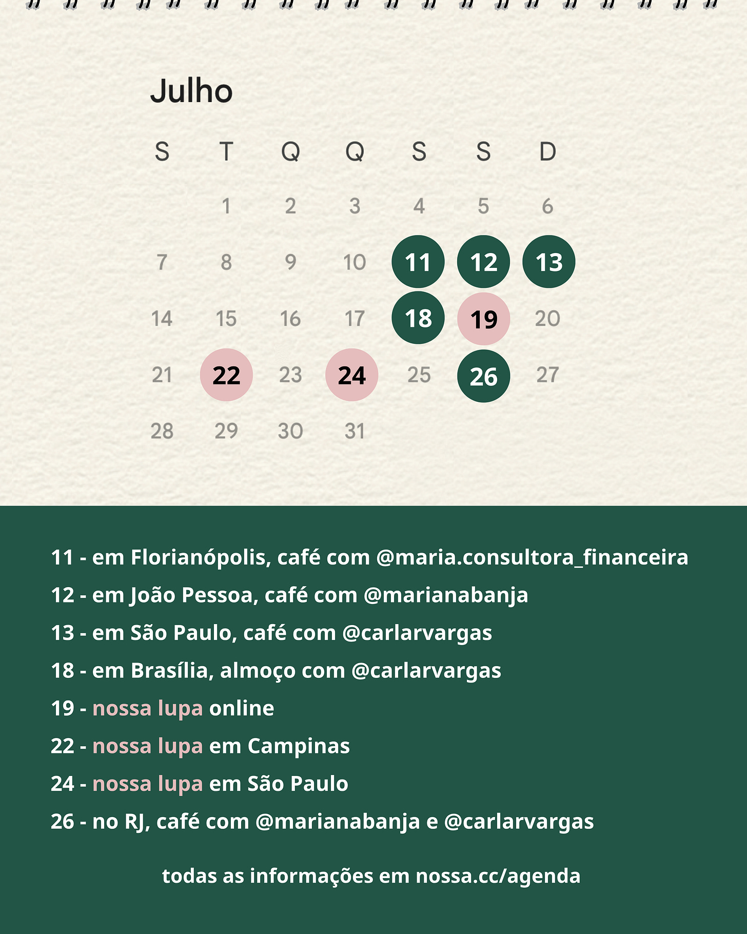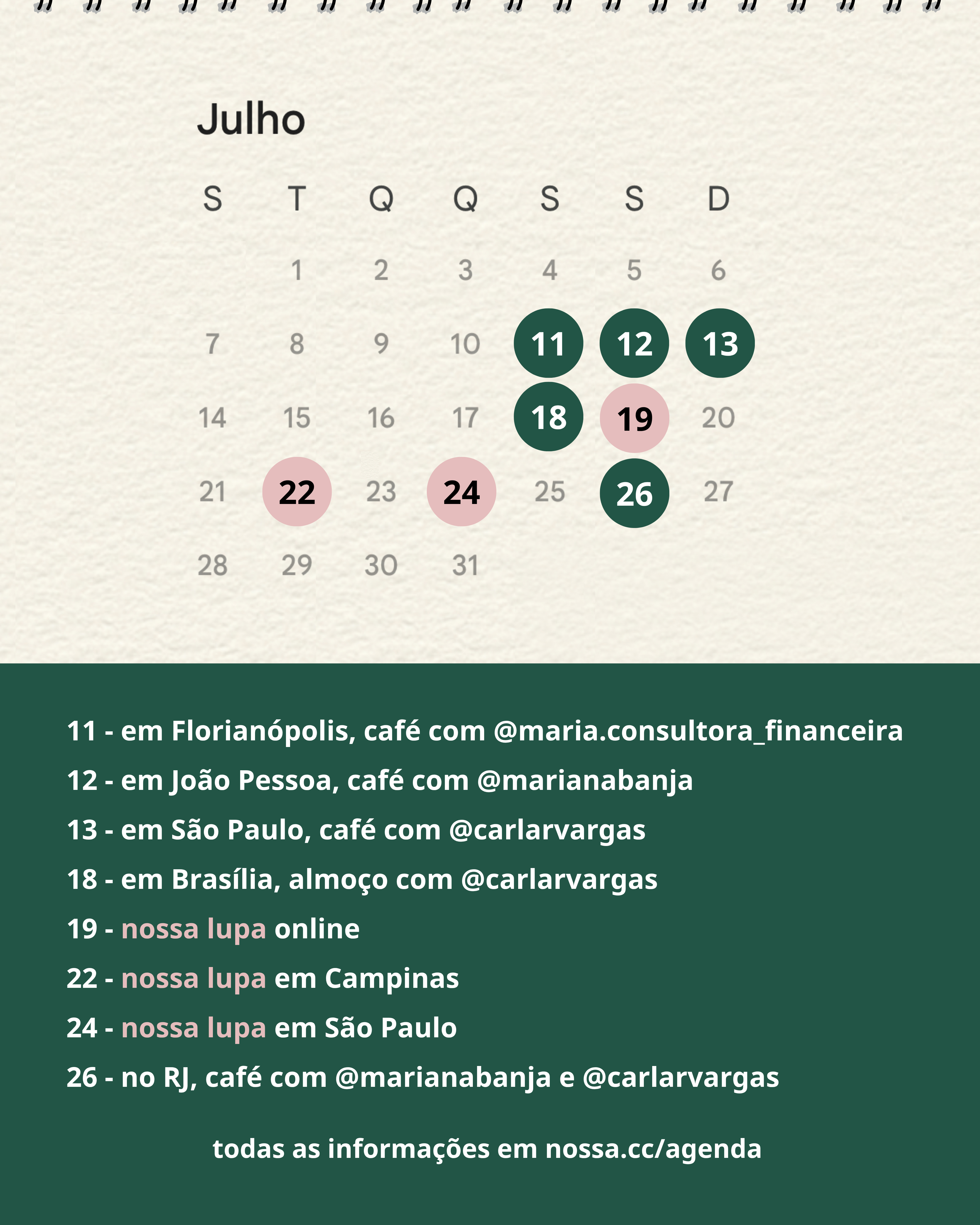 – Os dias destacados com a bolinha rosa são os dias em que teremos a nossa lupa, um evento conduzido por nós (Vivi e Amuri), tanto na versão presencial, quanto na versão online. É um formato totalmente novo, focado em modelagem de negócio, construção de repertório e comunidade, três temáticas indispensáveis para qualquer planejador financeiro. Lembrem por aí, conexão e caminho, conexão e caminho, conexão e caminho.